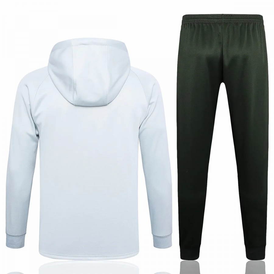 FC Barcelona, authentic hooded training presentation bench tracksuit designed by Nike for 2023/2024 international soccer season in spanish La liga and UEFA Champions League. This beautiful, modern-looking bench set will be worn by coach Xavi, players and staff before and during their matches at Camp Nou. It features dark beige hooded jacket and matching dark olive green pants, both with the iconic swoosh and FCB crest. Perfect choice for your leisure and sports time: show your support for Barça!