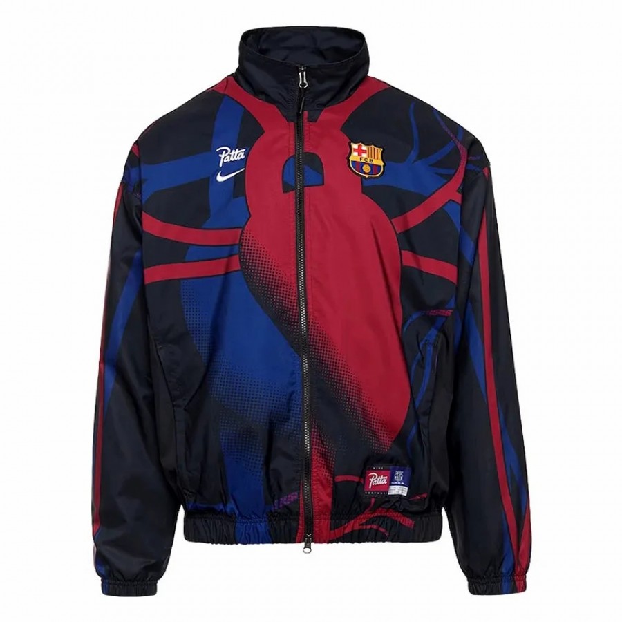 FC Barcelona x Patta tracksuit top. Long-sleeved featuring a patch with FC Barcelona crest and contrasting Patta and Nike logos. Pulsing graphics in Blue and Garnet both front and back. With elasticated cuffs and waistband. Side pockets. Soft finish inside.