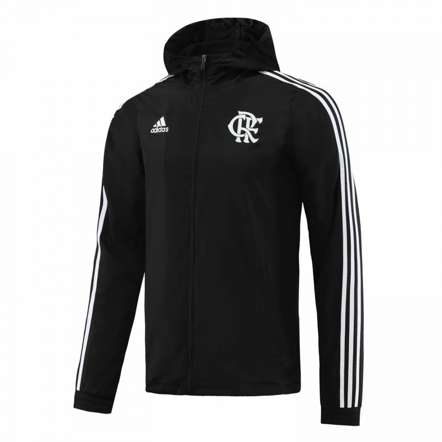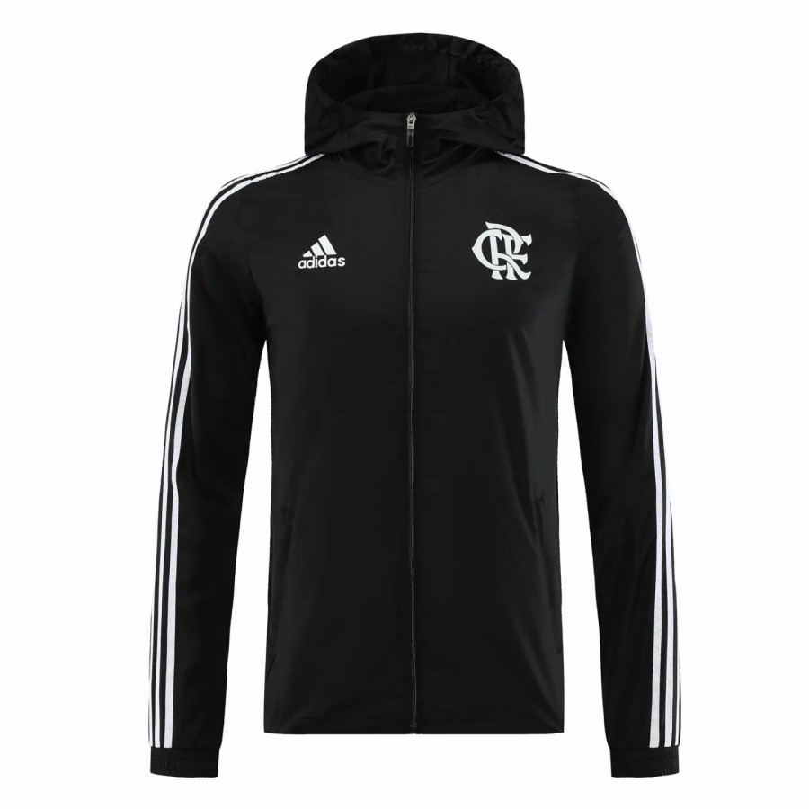Developed by Adidas, the Flamengo Mens Windrunner Full Zip Hooded Soccer Jacket Black 2023-24 is an excellent option for training on cold days. Made with polyester, the piece has high collar with fixed hood, has also two front pockets and the club's badge on the chest.