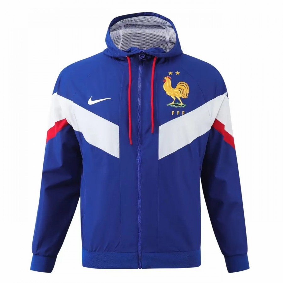 Show your support for french soccer and the FFF! Authentic France Mens Hooded Windbreaker Soccer Jacket 2024-25 designed by Nike for international seasons 2024/2025. This full zip hoodie, features a beautiful navy, white and red details. Wear with pride, like Mbappé, Benzema and all the french stars!
