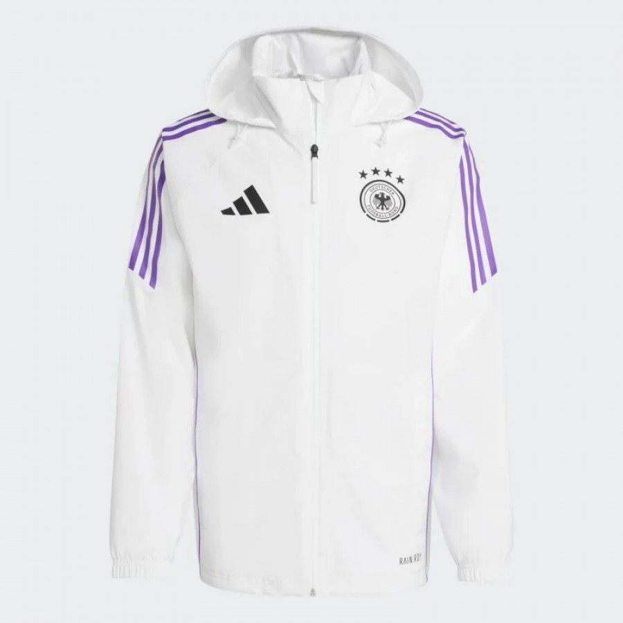 No matter the weather, your passion for the game remains unshaken. The adidas Germany Mens Tiro 24 Player Rain Soccer Jacket 2024-25 is a genuine piece of DFB team gear, embodying authenticity and showcasing the true spirit of the team. Featuring a convenient bungee-adjustable hood and RAIN.RDY technology, this jacket ensures you stay dry and focused on your training, even under rainy conditions. When the skies clear, you can easily pack the hood away, but the iconic Germany crest will always be proudly displayed, emphasizing your connection to the team.