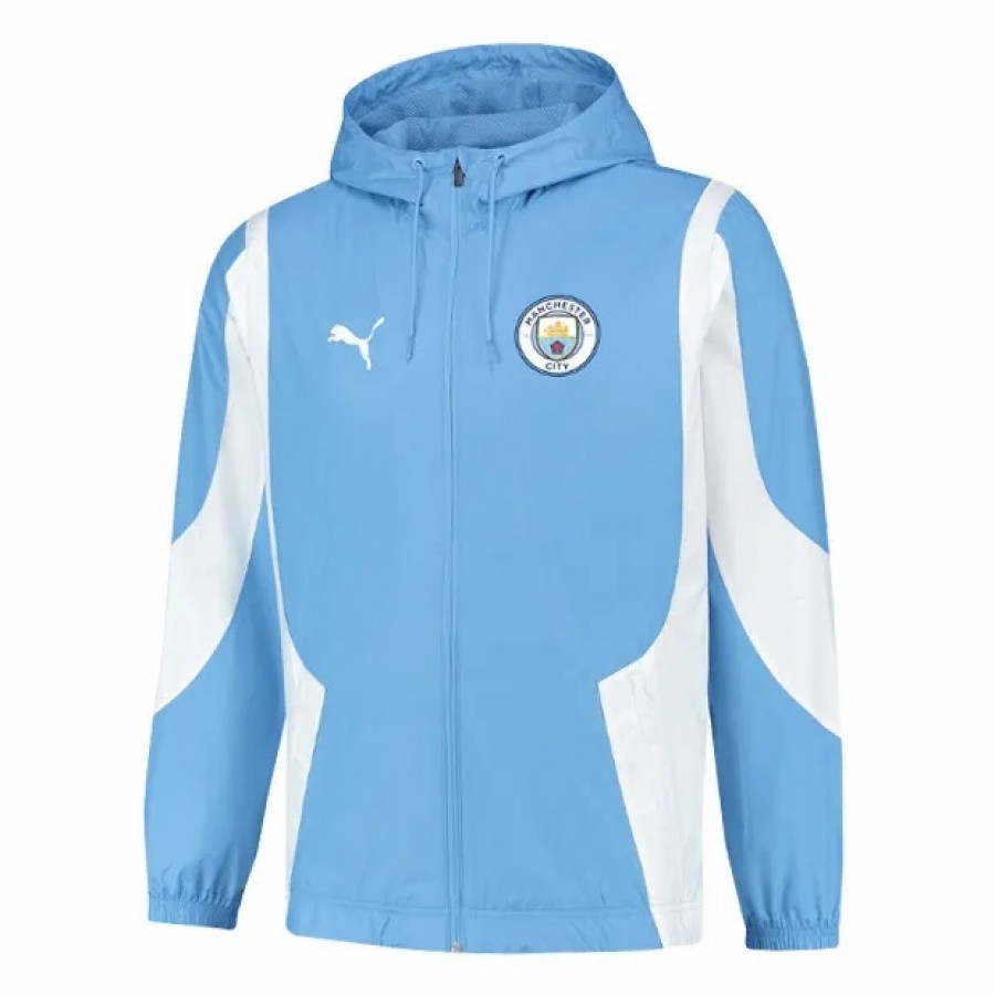 Combine style and function in once piece of game day outerwear with this Manchester City Mens Pre Match Anthem Full Zip Hoodie Soccer Jacket 2023-24 from Puma. This extra layer has a full-zip construction for easy adjustments, and the drawstring hood allows for additional coverage when necessary. Complete with detailed Manchester City graphics, this jacket is the perfect way to highlight your favorite Premier League squad.
